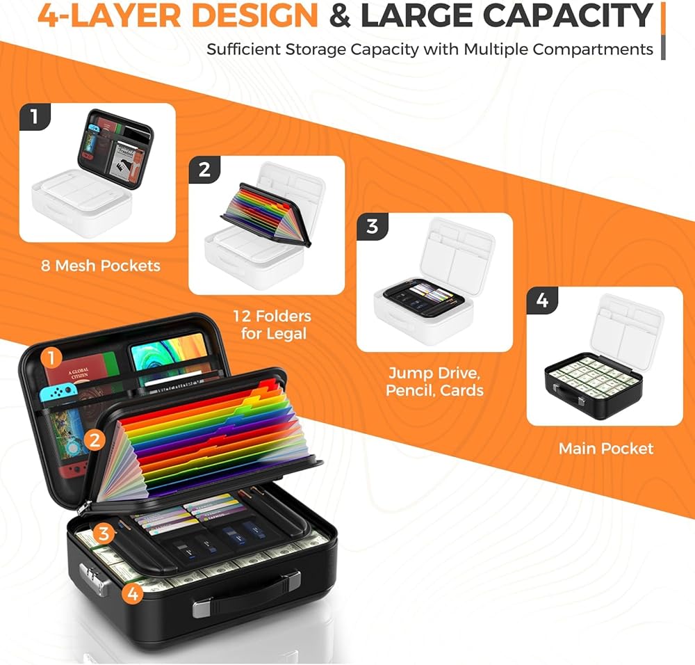 Large Capacity & Multi-Compartment Organization: With a size of 15.8 x 11.8 x 5.4 inches, this fireproof document box provides ample space. It features 12 accordion folders, 2 main mesh pockets, 16 card slots, 2 USB pockets, and 4 pen slots.