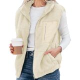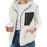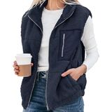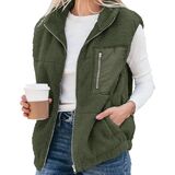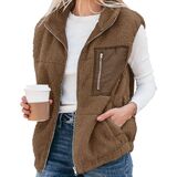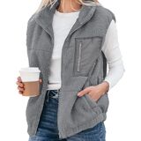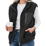 Feature: Full zip up turn down collar sherpa vest jacket, sleeveless with zipper chest pocket design, solid color casual relaxed oversized fit