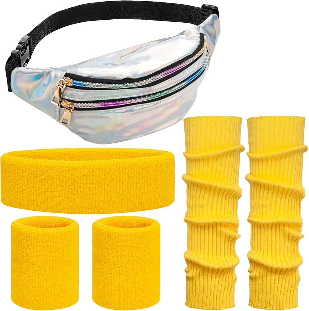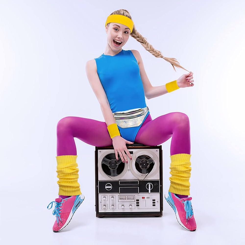 💖 PACKAGE CONTENT: The 80s outfit for women include 1 piece of holographic belt bag, 1 pairs of knit leg warmers, 1 neon headband x 2 wristbands; All accessories vintage design suitable for exercise and 80's party will make you stand out from the crowd, show your personality.