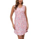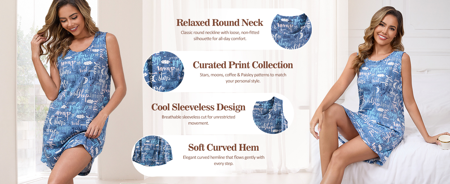 Comfortable Fit Sleepwear:Featuring a loose and roomy design in jersey knit fabric with Sleeveless,R-Neck,mid-knee length, curved hemline design,and pullover style, our nightgown fits all body types and lets free-range movement of your body