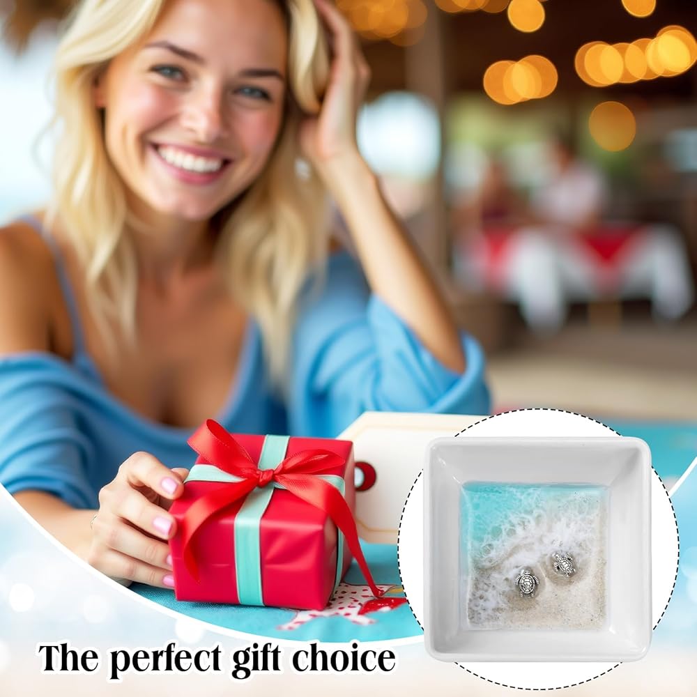 Every handmade ocean resin jewelry tray is a labor of love, crafted with meticulous attention to detail. This mini turtle square ring dish showcases the artisan's dedication to creating a product that is not only beautiful but also deeply meaningful. The fusion of ceramic and resin results in a trinket dish that's as sturdy as it is stunning, nice for adorning your personal space with a touch of handcrafted elegance.