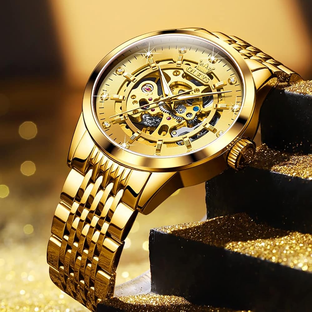 ⌚ Business Luxury Skeleton Watches for Men: creative design double-sided gold skeleton three-dimensional dial, smooth metal texture, shiny diamond scale, staggered line design, see-through movement operation, highlighting the luxury and fashion of the watch.