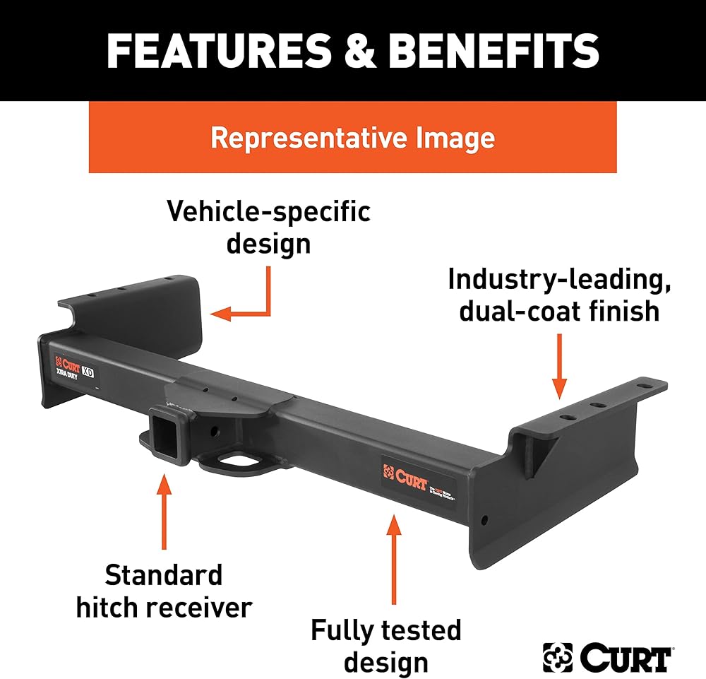 When we came to the limits of towing capacity, we wanted to know what else was out there. What could we discover off the beaten path? So, we kept going. CURT class 5 Xtra Duty hitches begin a class of their own, beyond class 4 and beyond anything the standards dictate. They are designed for the hard road where only full-size pickup trucks, vans and SUVs dare to tread. They are capable of pulling almost any heavy-duty trailer, including toy haulers, dump trailers, logging trailers, small yacht trailers and more (NOTE: Never exceed the lowest weight capacity of any towing component). This particular Xtra Duty class 5 trailer hitch offers a gross trailer weight capacity of 15,000 lbs. and an extra-high tongue weight capacity of 1,500 lbs. It features a 2" x 2" receiver tube opening to accept a ball mount or hitch-mounted accessory, such as a cargo carrier or winch mount. It is designed to be a custom-fit trailer hitch for certain years of the Ram 1500 and Dodge Ram 1500 (to verify compatibility with your vehicle, see application info). For a little extra towing power and stability, this class 5 hitch can also be used in combination with a weight distributing hitch. It is rated for 16,000 lbs. WD and 1,600 lbs. WDTW. In our drive to create a more powerful hitch, CURT has not neglected the finer details. Our class 5 trailer hitches are welded with precision and go through multiple stages of cleaning to create a smooth surface that is ready to accept our co-cured finish. To protect them from corrosion, chipping and UV damage, these hitches are immersed in a liquid A-coat and then finished in a high-quality black carbide powder coat. They come with grade-8 mounting hardware for solid installation.
