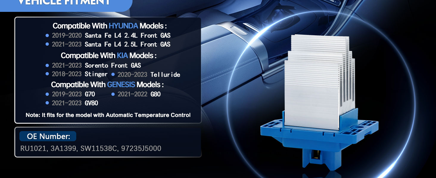 【Compatible OEM Numbers】OE Replacement HVAC Blower Motor Resistor, Directly Fit. Reference Number: RU1021, 3A1399, SW11538C, 97235J5000. Meets or exceeds OEM standards, 100% tested before shipping. We only use the highest grade materials to enhance your love car performance