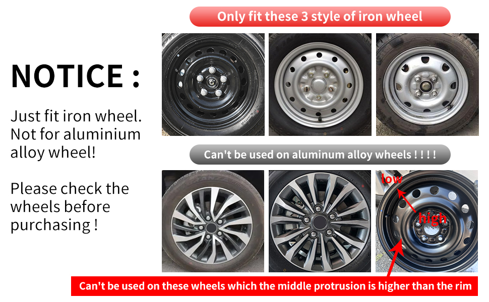 Please Ensure to Check your Tire/Wheel Size Before Purchase! Designed for 15 inch Iron Rim and Can't be used on aluminum alloy wheels .
