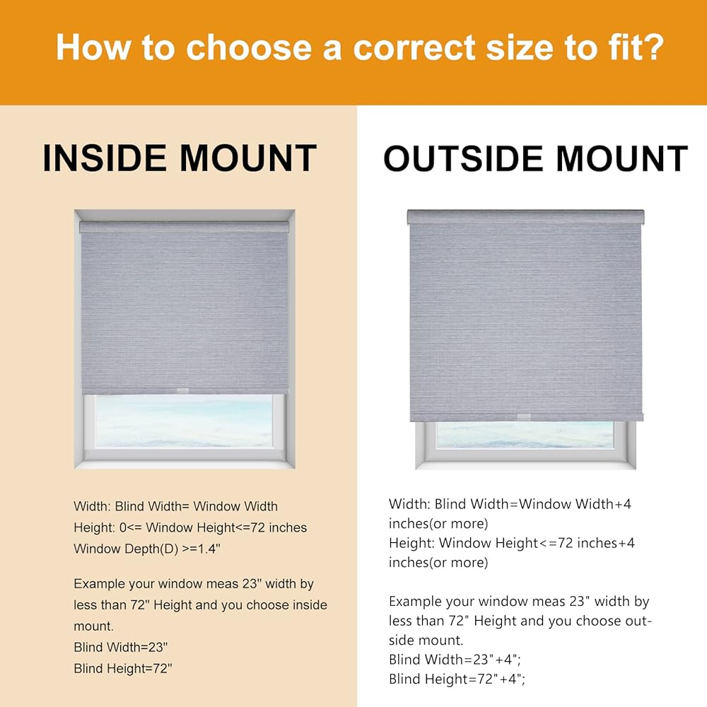 【How to choose a correct size to fit? Example your window meas 23" width by 72" length.】INSIDE MOUNT: window width is blind width, window height is blind height. Blind Width=23"; Blind Height=72". OUTSIDE MOUNT: Plus at least 4" is blind width, plus at least 4" is blind height. Blind Width=23"+4"; Blind Height=72"+4".【Pls Note】Fabric width will be 0.8" shorter than the size of the shade. If your height differs too much from the existing blind height, please choose a custom size.