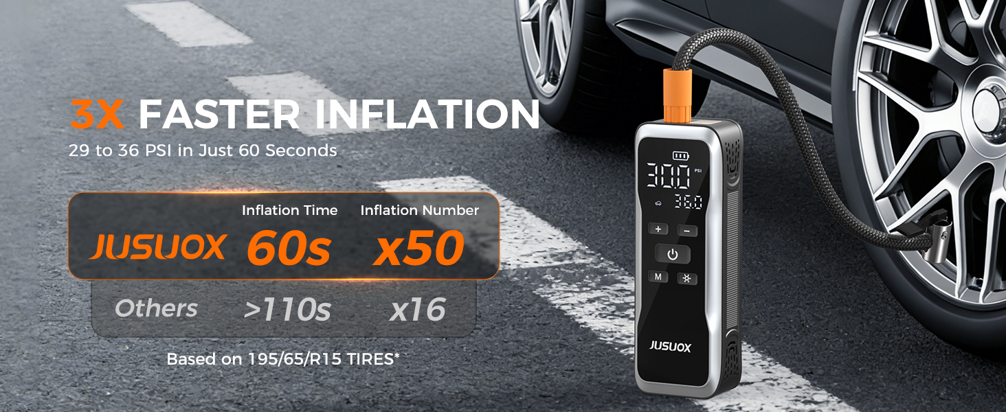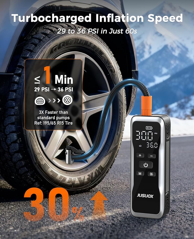 3X Faster Inflation & 150PSI Power: Experience industry-leading efficiency with a 34L/min airflow. This turbocharged pump inflates a standard tire (195/65/R15) from 29 to 36 PSI in just 60 seconds. With a maximum pressure of 150 PSI, it effortlessly handles everything from professional mountain bikes to heavy-duty SUVs, ensuring you get back on the road without the wait.
