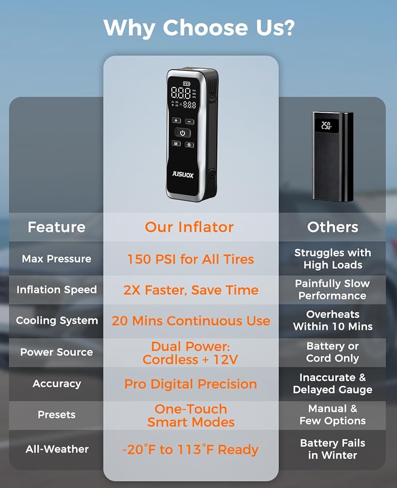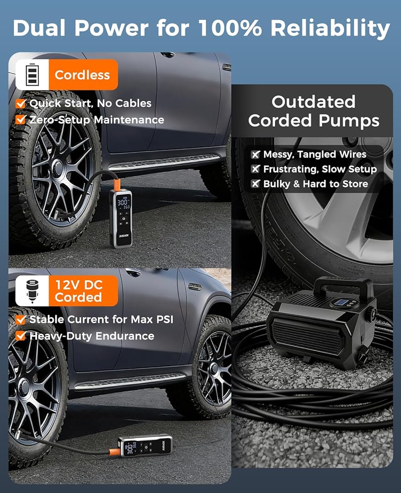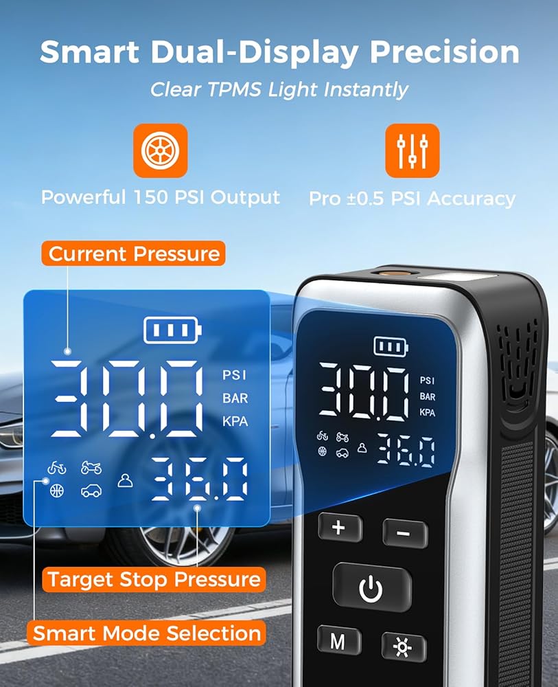 Smart Dual-Screen & Auto-Stop Tech: Eliminate guesswork with our high-precision dual LCD display, which shows both real-time tire pressure and your target preset simultaneously. The intelligent chip ensures ±0.5 PSI accuracy and triggers an automatic shut-off the instant your target is reached, preventing over-inflation and protecting your tire's lifespan during midnight repairs.