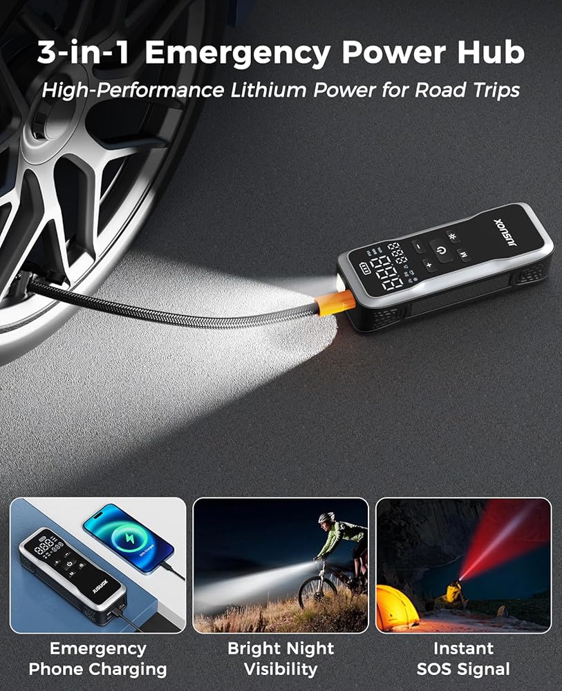 3-in-1 Emergency Hub & Compact Design: Beyond inflation, this is your roadside survival tool. It features a multi-mode LED light (Steady/Flash/SOS) for night visibility and a USB-C output to act as an emergency power bank for your phone. Its compact, handheld design fits easily in a glove box or backpack, ensuring safety and convenience are always within reach.