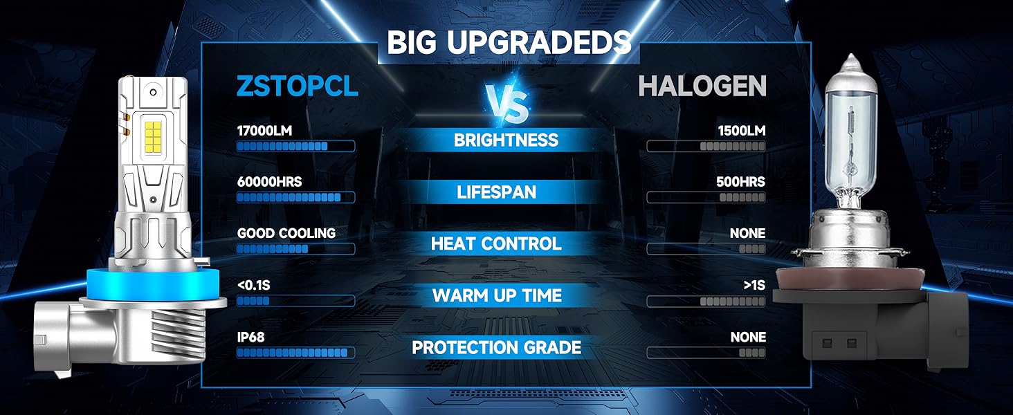 【Upgraded 700% Brightness】ZSTOPCL latest 6000K cool white light bulb adopts a double-sided 16pcs CSP Chips design, with a full light pattern and no black spots. It can up to 17000LM, which is 700% brighter than the original car halogen lamp, making your night driving vision clearer and enjoying the fun of night driving