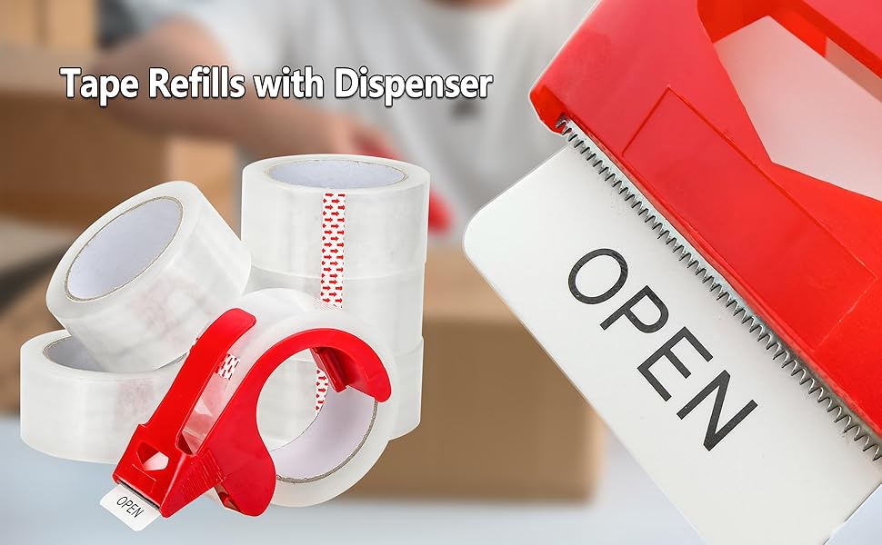 - شريط التعبئة: يأتي مع 12 لفة وموزع شريط، 1.88 بوصة × 60 ياردة لكل لفة، إجمالي 720 ياردة. حجم رائع لحمل الصناديق في المكتب والمستودع والمنزل