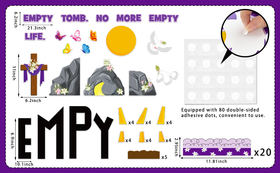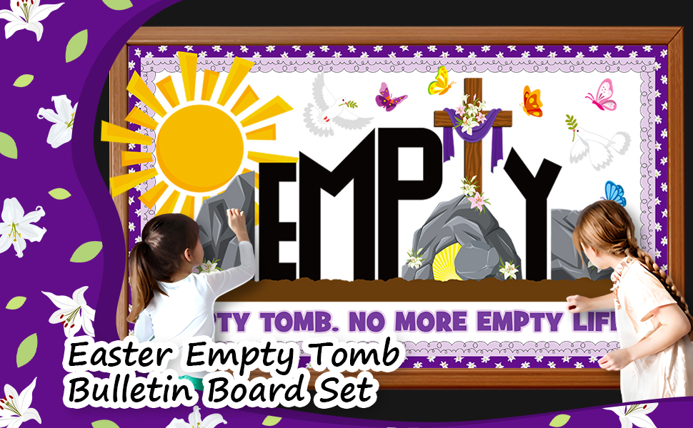 Complete Easter Empty Tomb Bulletin Board Set: Stop buying pieces separately! This all-in-one Easter empty tomb classroom decoration set features the meaningful "EMPTY TOMB. NO MORE EMPTY LIFE" slogan cutouts, a large empty tomb scene, religious cross cutouts, sun, butterfly, lily and white dove cutouts, Easter themed bulletin board borders, and plenty of glue points. You can turn any blank wall into a powerful Easter faith display in minutes with no extra tools needed