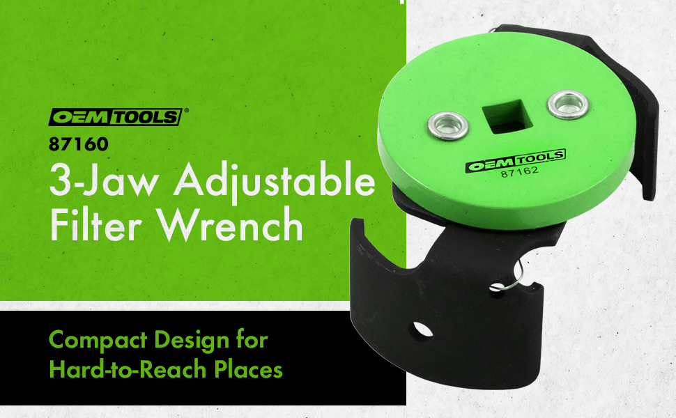 The OEMTOOLS 87162 Wide Range Filter Wrench makes oil filter changes a breeze. This adjustable oil filter removal tool size ranges from 3-1/8 inches to 3-7/8 inches (79.4MM to 98.4MM) and works on almost all import cars and also the more common 3-inch domestic car filters. The specially designed construction makes oil filter removal simple. This cam action oil filter puller provides all the torque you need to remove tough filters. Stubborn filters don't stand a chance. The spring loaded jaws make the adjustable filter wrench easy to expand and compress, and gives you an exact fit every time. Thanks to the forged 3/8-inch drive, stripping is a thing of the past. No matter how much force you use, the 3/8-inch drive won't get damaged. Don't worry about working in tight spaces either. Our oil filter puller has a compact design which means removing filters in close quarters is effortless. Make even the most difficult jobs easy with our cam action oil filter wrench.