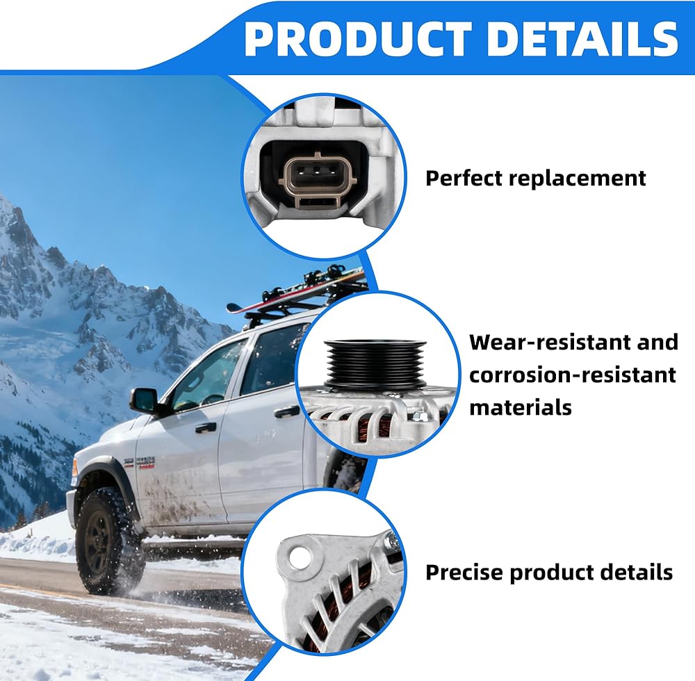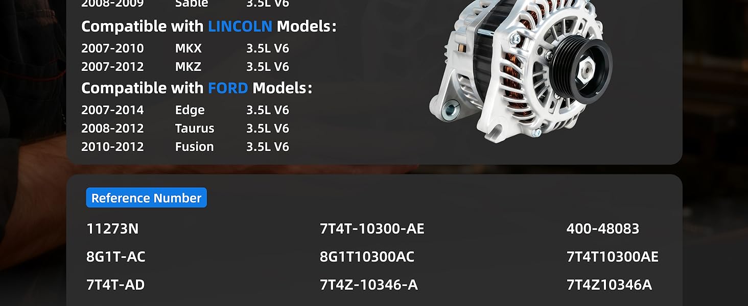 【Exact Fit & Broad Compatibility】: Direct replacement alternator fit for (11273N,8G1T-AC,7T4T-AD,A003TJ2891,AMT0225,7T4T-10300-AE,8G1T10300AC,7T4Z-10346-A,A003TJ2891CZ,400-48083,7T4T10300AE,7T4Z10346A,400-48246). Verify your vehicle details and part number for a perfect, hassle-free fitment
