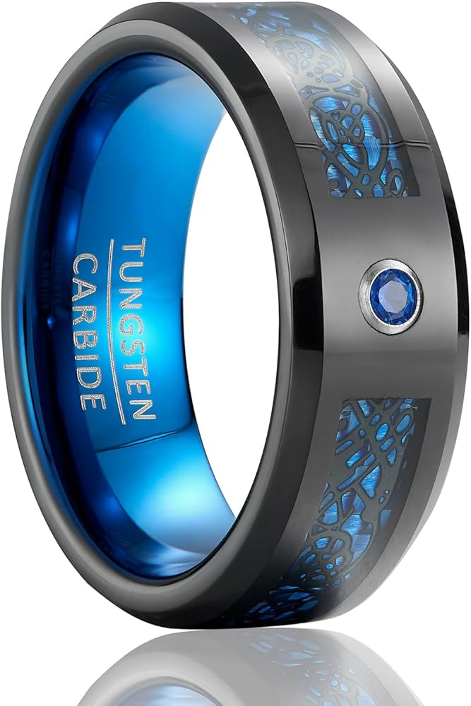 【Premium Black Tungsten with Blue Accents】 Crafted from solid, scratch-resistant tungsten carbide with a deep black finish and beveled edges. The band features a fully polished blue comfort-fit interior, blending substantial presence with all-day wearability and a cohesive color scheme.