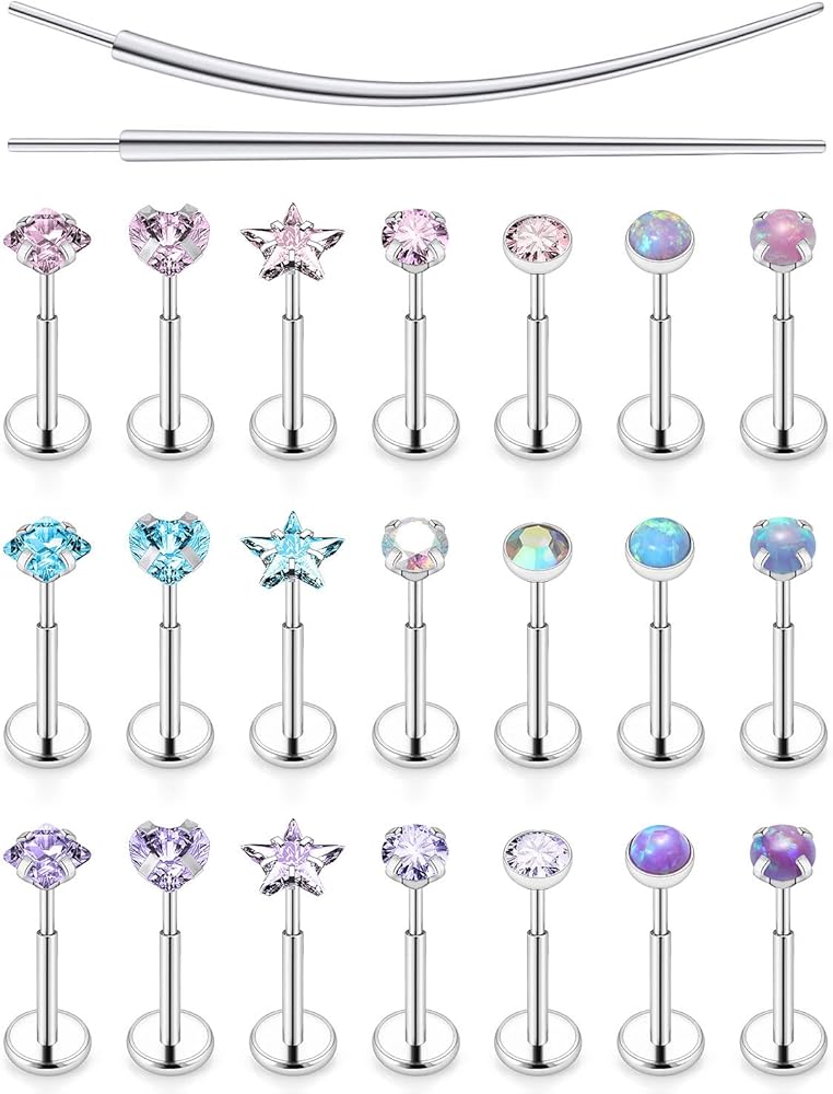 - 21pcs 16g 1/4 Threadless Flat Back Stud Piercing Jewelry with 2Types Taper Insertion Changing Tool.