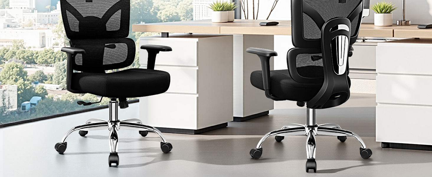 【High-Resilience Thickened Seat Cushion】 This desk chair is made with a 3.94'' thick high-density molded sponge—highly resilient and non-sagging. Its widened and thickened design effectively reduces pelvic pressure. Equipped with a breathable, high-elastic mesh backrest, the mesh office chair promotes air circulation to keep you cool and comfortable at all times, maximizing sitting comfort