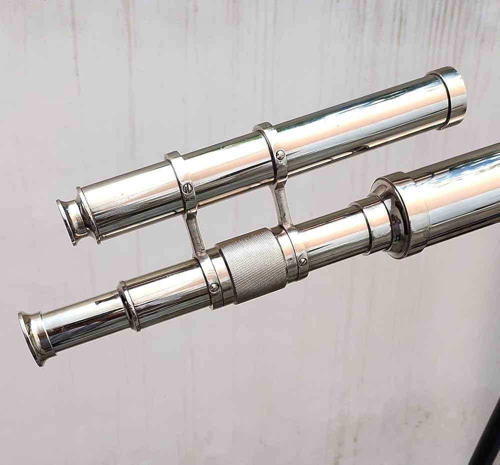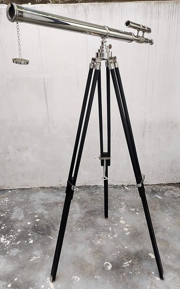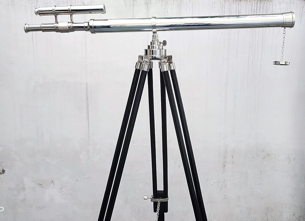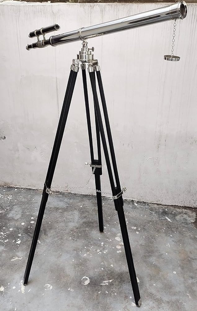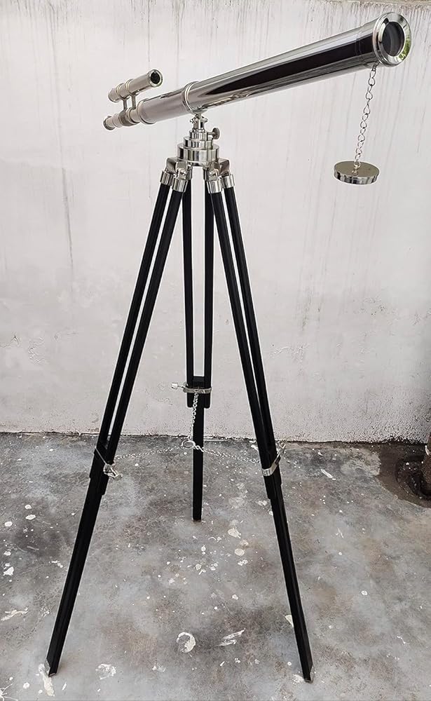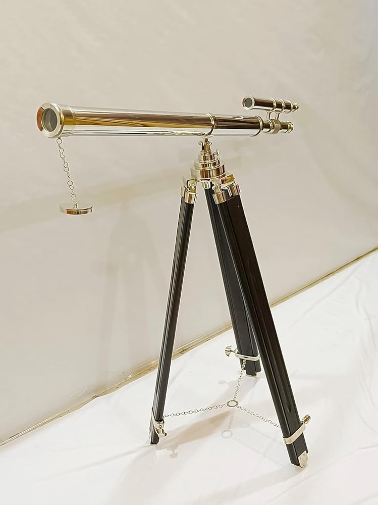 Material used : Solid Brass and Excellent Quality Wood, Color : Nickle Finish and Wooden. , Crafted from solid brass, this telescope is mounted on a sturdy black wooden tripod. A sturdy wooden tripod supports the telescope when standing that adds class and sophistication to any room it's in.