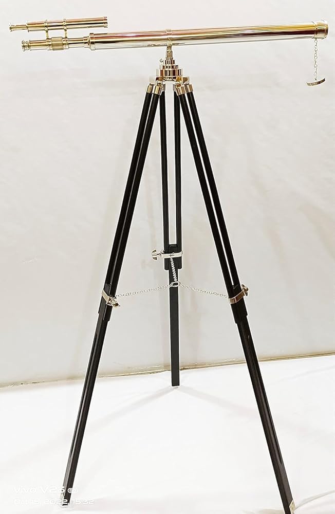 Tube Length : 39" inches, Height : 65" inches, Diameter : 25" inches, Weight : 7 kg, This telescope adds a shine to any room it enters. You can present this beautiful decorative telescope to your loved ones. Material used : Solid Brass and Excellent Quality Wood, Color : Copper Dark Nickle Finish and Natural Wooden. , Crafted from solid brass, this telescope is mounted on a sturdy black wooden tripod. A sturdy wooden tripod supports the telescope when standing that adds class and sophistication to any room it's in.