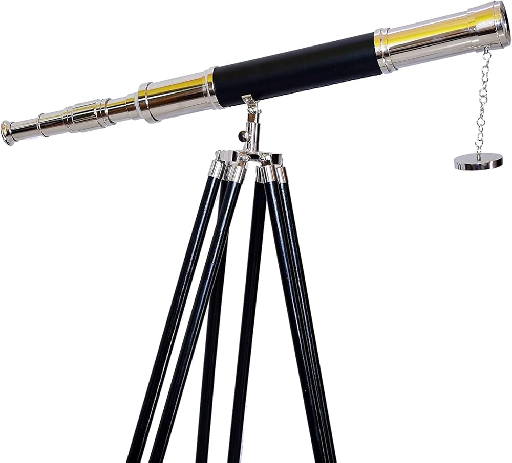 Material Used : Brass and Wood, Color : Silver/Nickel Finish and Black Tripod, Vintage marine models to the real world and use , item is made of brass and polished to chrome finish and give an elegant look to your place.