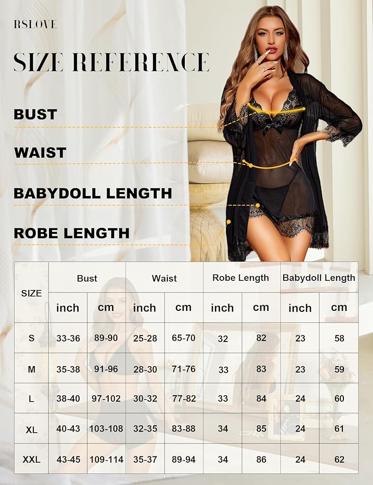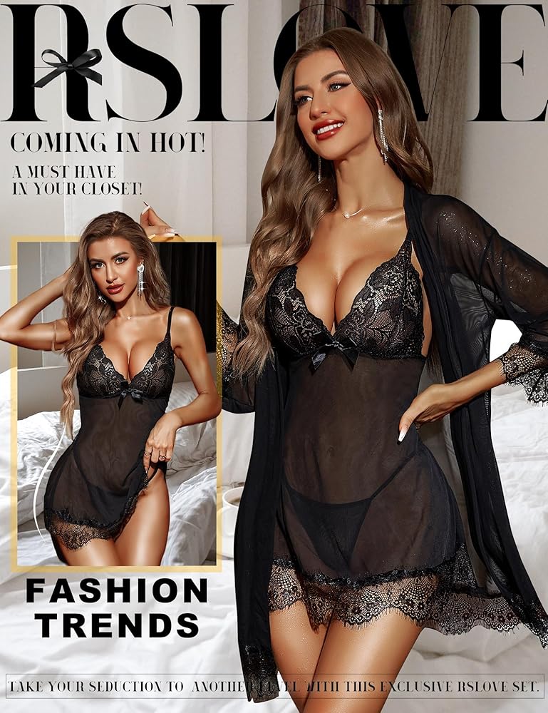 LUXURY 3-PIECE SET: This 3 piece lingerie sets consists of a sexy lace babydoll, mesh robe, and thong. The babydoll features a sexy deep V-neckline with bow accents and adjustable shoulder straps. The sexy robe is adorned with soft lace trim. It's the perfect blend of comfort and sexiness. Let's be elegant, sexy, and confident with RSLOVE luxury lingerie set.
