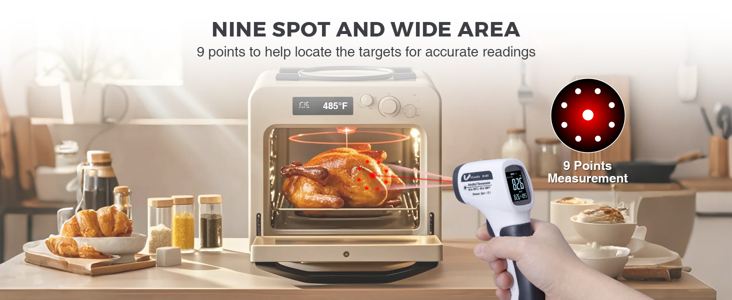 Safe Non-Contact Measurement: Featuring a 12:1 distance-to-spot ratio, this IR thermometer safely measures hot surfaces, grill plates, oven racks, or hard-to-reach areas without direct contact