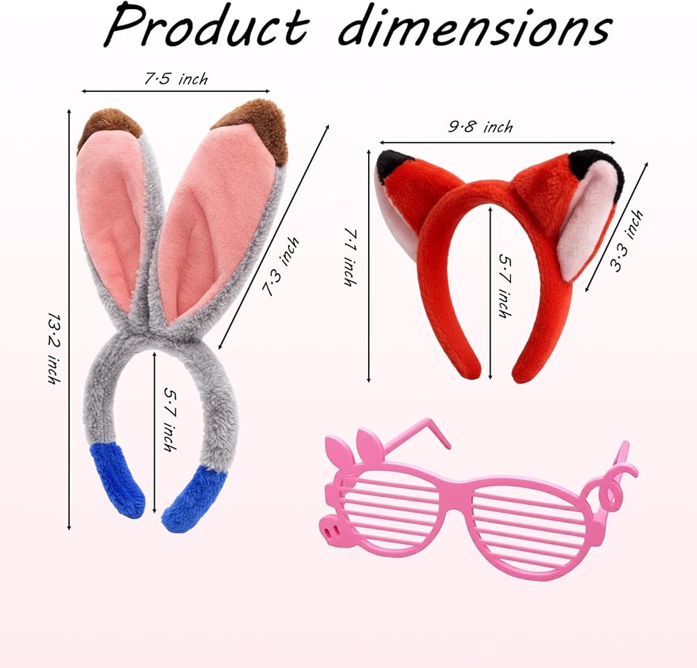 Animal-Themed Headbands: This three-piece set includes charming fox and bunny ears headbands, designed for costume events and photo sessions; The collection features a pig glasses accessory, creating versatile styling options for various occasions; Made with attention to detail, these headbands offer a playful addition to dress-up activities