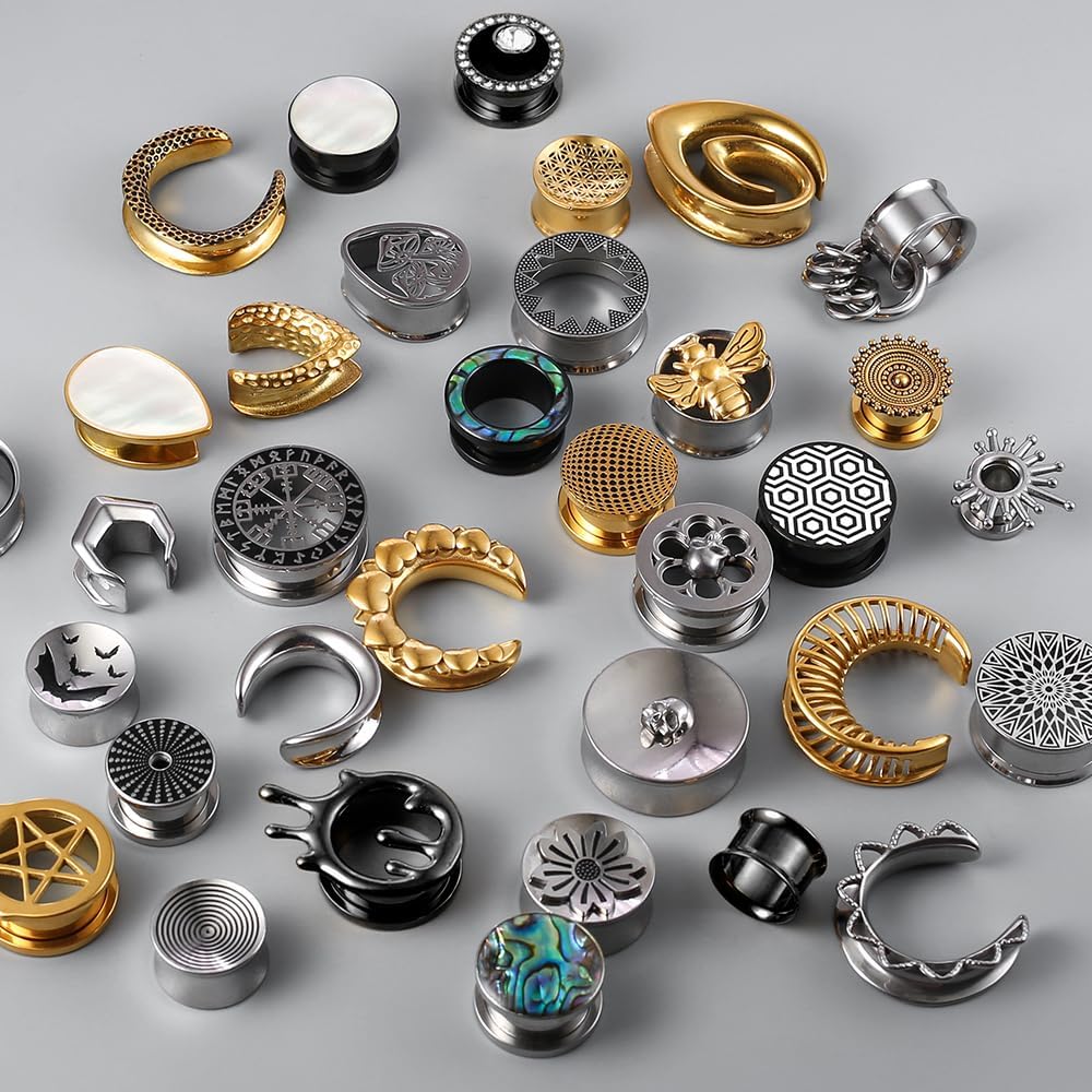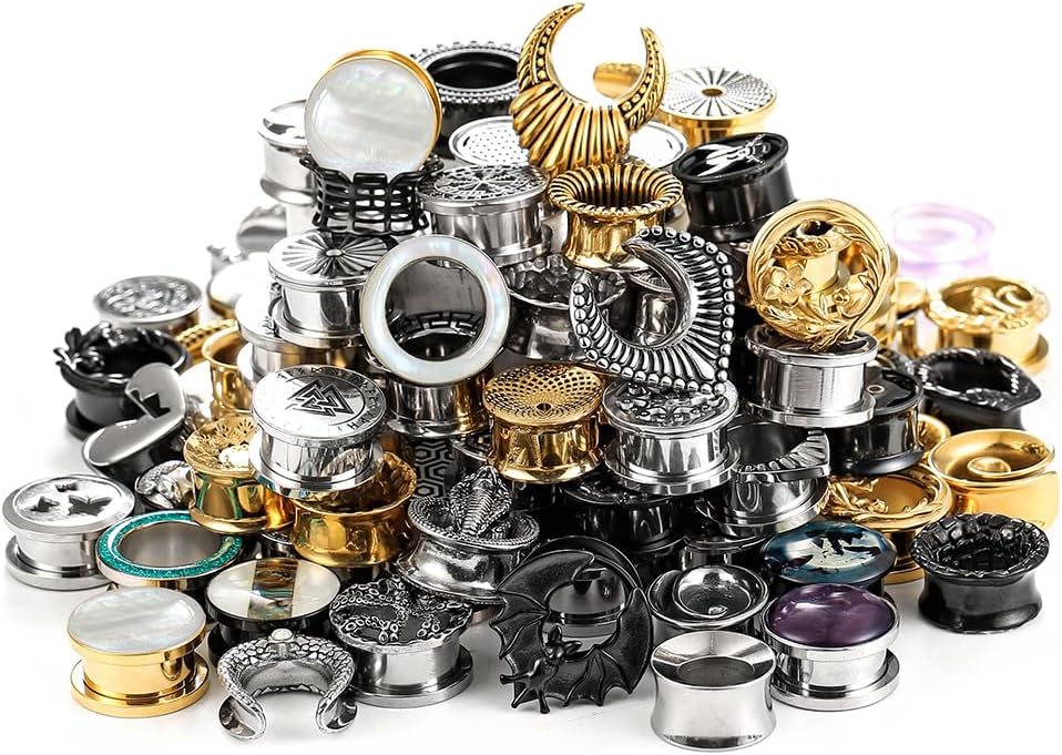[ You Will Get ]: A Blind Box including 10 PCS same size mixed with ear tunnels, ear plugs, ear gauges, saddle plugs or even ear weights in different designs or colors.A surprising bag full of mystery and joy, all items in good condition out of strict quality checking. Pls note no return for this lot, pnly refund for quality problem.