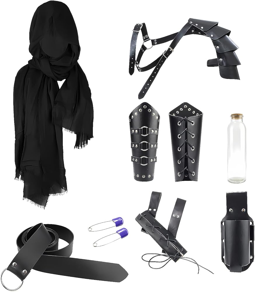 • 8PCS Medieval Knight Costumes: Put on our knight costume men set and feel the atmosphere of the Renaissance. Includes one Medieval Renaissance period shoulder armor *1, half-shoulder cloak *1, medieval belt *1, leather bracers*2, water bottle *1, water bottle holder *1, pins *2, and sword belt *1, ensuring you are fully equipped for any royal event