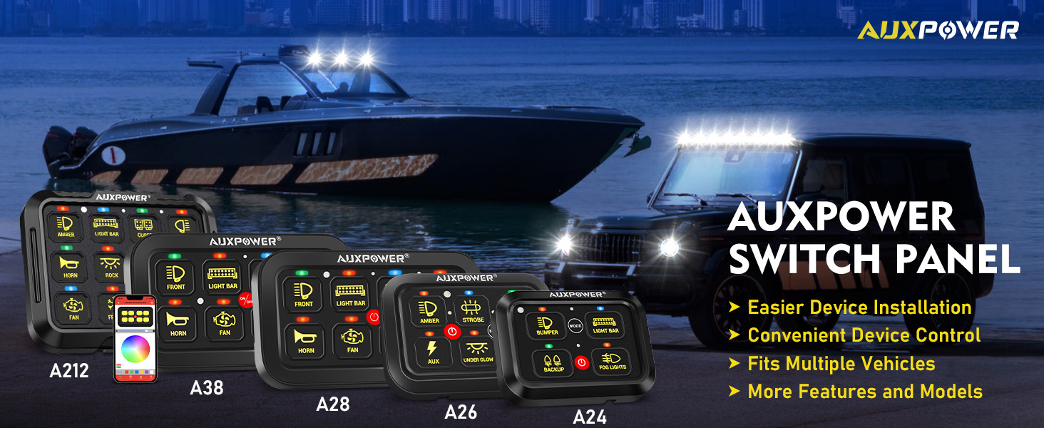 【Universal Vehicle Compatibility】Designed for virtually all vehicles: trucks, off-road vehicles, UTVs, ATVs, boats, RVs, SUVs, and more. The AUXPOWER A26 switch panel is your ideal solution for organizing and controlling multiple automotive accessories with precision.
