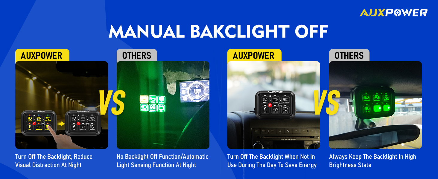 【Intelligent Auto-Dimming & One-Touch Backlit Off】The panel automatically adjusts backlight brightness based on ambient light conditions, reducing glare during night drives and enhancing visibility in tunnels. Quickly disable all backlights with a single press of the "MODE" button for distraction-free daytime driving.