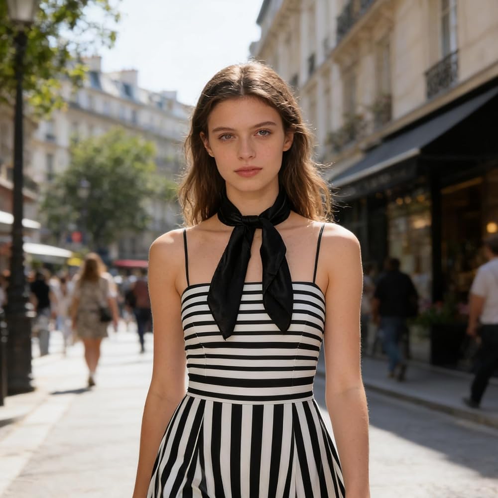 Tie the scarf into a crisp bow around your neck, drape it elegantly through your hair as a headband, or casually drape it over your bag as an accent. The silk's inherent subtle sheen and fluid drape lend an air of sophistication to every styling choice, exuding understated French elegance and sharp sophistication.