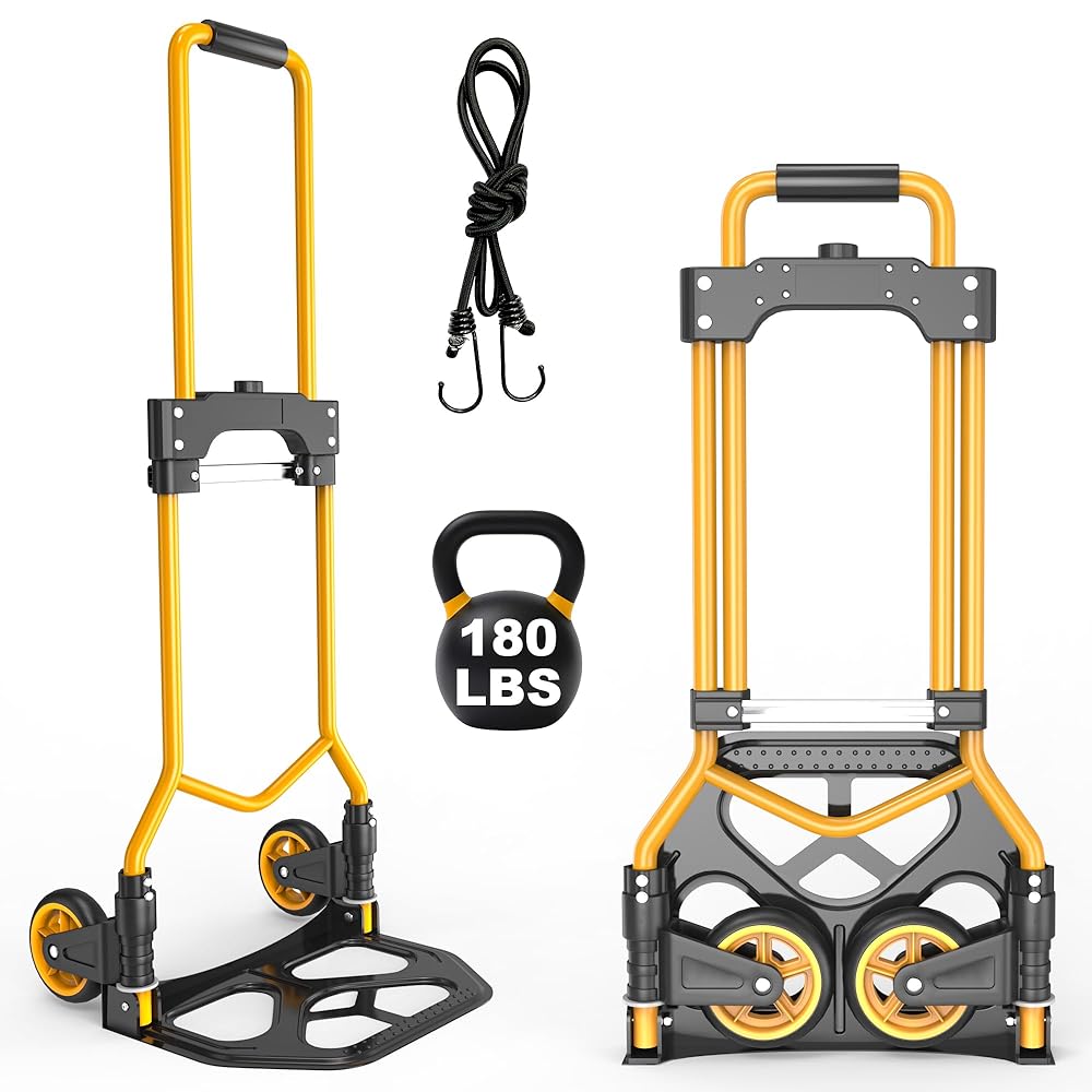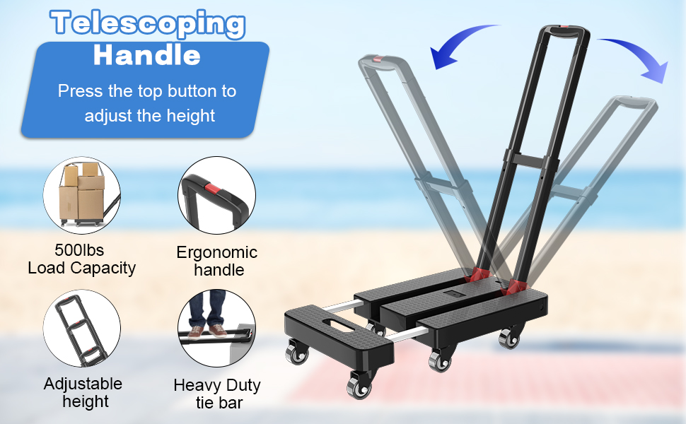 Adjustable Handle: The folding dolly's 3-height (16–36 inches) telescoping handle tilts 180°, suiting all users. Made of thickened, rust-proof material, it's lightweight, sturdy, and easy to grip for comfortable control.