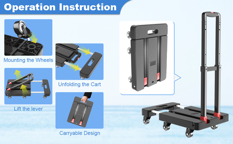 Fold Up for Easier Storage: At just 6.5LBS, this lightweight folding hand truck folds/unfolds in seconds, with easy assembly (wheels attach in minutes). The folding cart stores flat (17.32 x 12.20 x 4.53 inches) in vehicles or closets, and extends to 22.20 x 12.20 x 36.02 inches for use—blending portability and practicality.