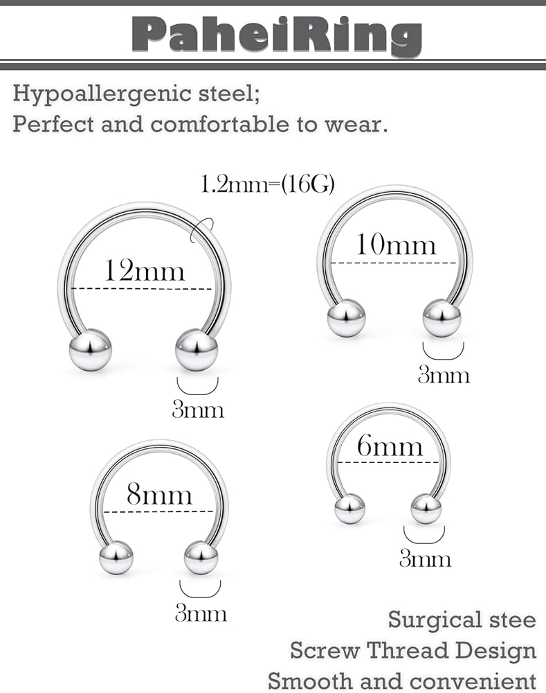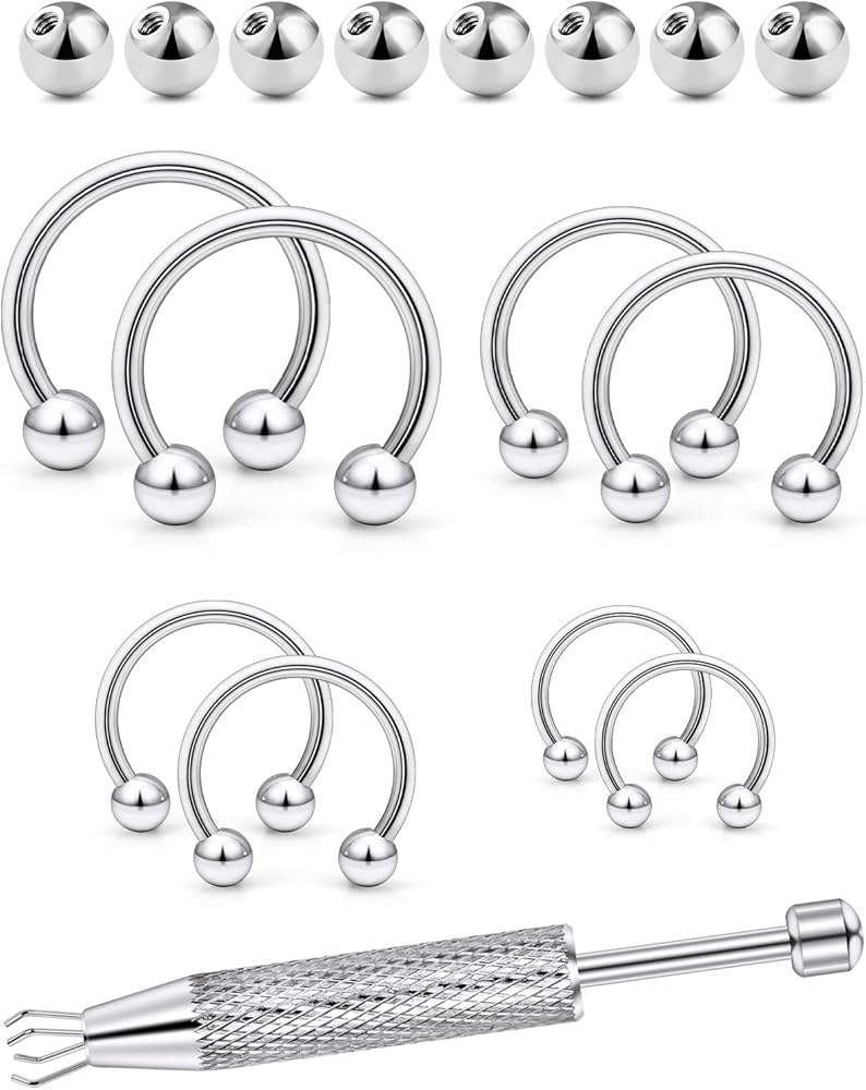 • 17PCS Full Piercing Set: Includes 8 gold-plated horseshoe rings (2 each of 6/8/10/12mm), 8 ball accessories, and 1 bead helper tool. Sufficient for daily wear and accessory replacements.