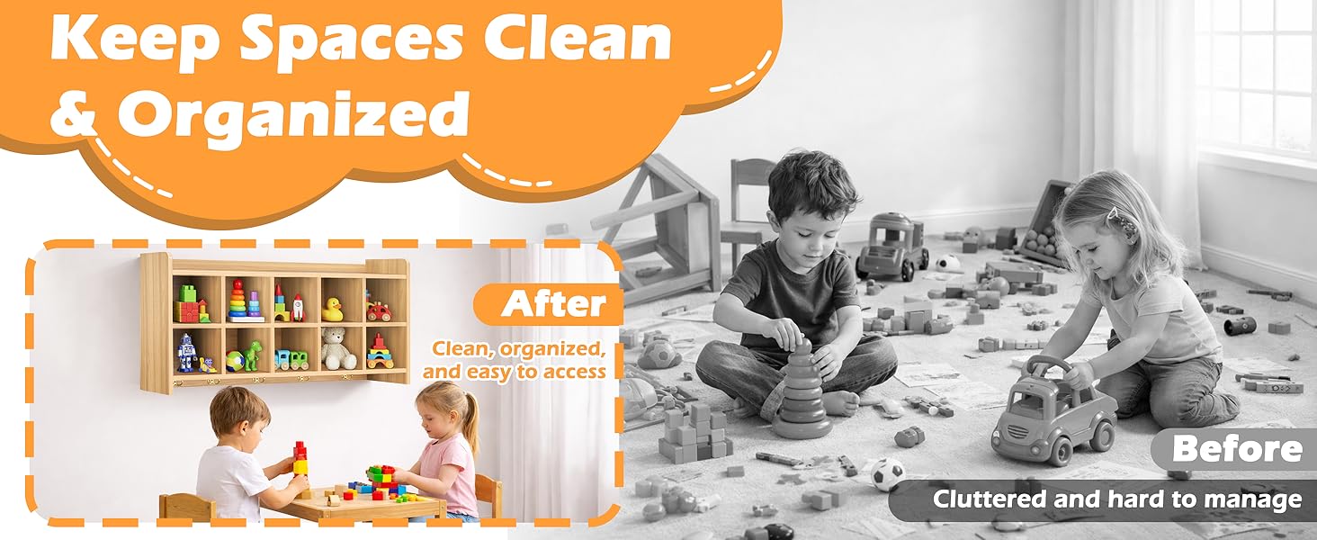 【Maximize Wall Space, Minimize Clutter】Designed for modern homes, this wooden wall cubby helps keep kids' rooms, playrooms, and shared spaces organized without taking up floor space. The wall-mounted design creates a cleaner, more open environment while keeping daily essentials neatly stored and easy to reach.
