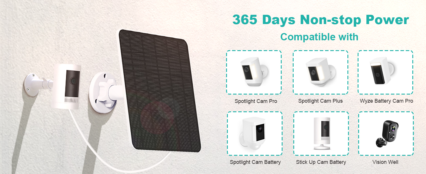 Compatibility: The 5w solar panel is compatible with Ring Stick Up Cam/Pro Battery, Spotlight Cam Plus/Pro Battery, Vision Well camera and Wyze Battery Cam Pro. The solar panel is not compatible with Blink Camera and any plug-in camera without battery.