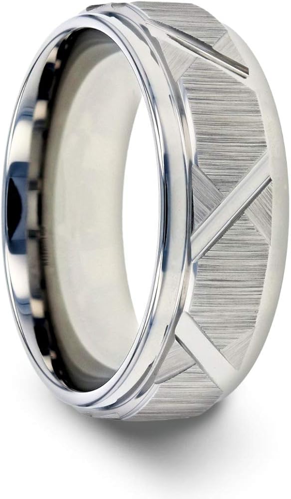 Unique, masculine, bold and eye-catching aptly describe this Tungsten ring with its intricate raised and brushed angular cuts. Made of tungsten carbide which provides excellent durability and long-lasting luster. For any occasion like wedding, anniversary, engagement, or birthday, our scratch resistant rings are the perfect statement for that special gentleman or lady in your life.