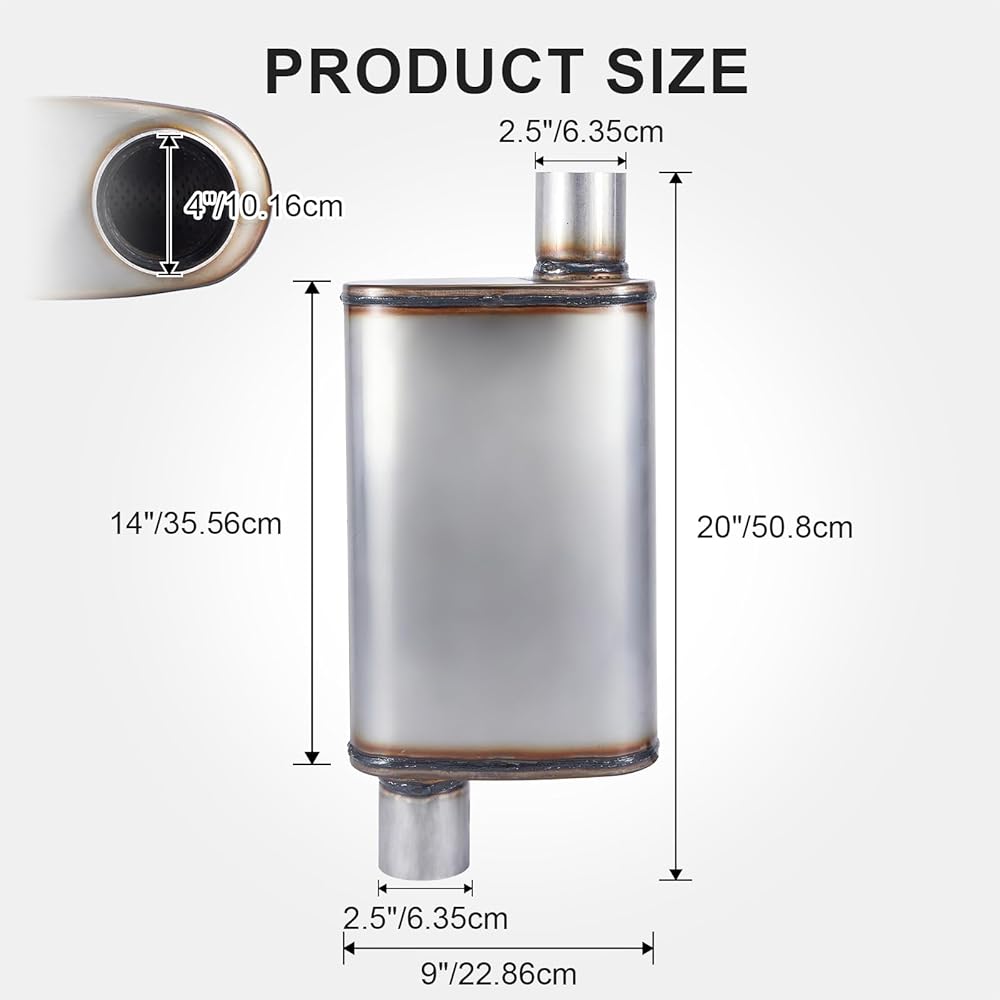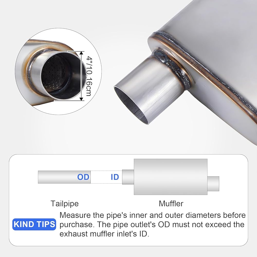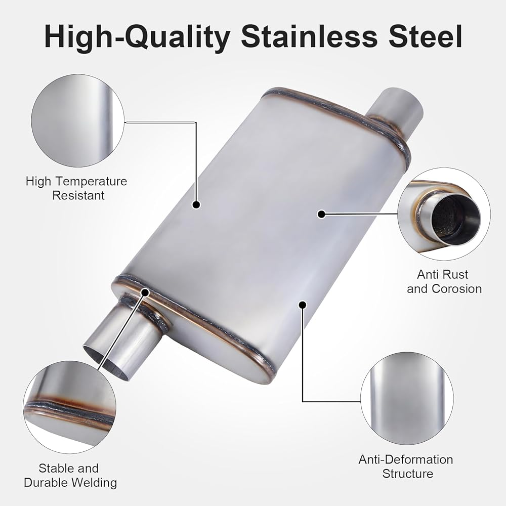 DURABLE STAINLESS STEEL: Universal exhaust muffler constructed from high-quality 409 stainless steel, it offers strong corrosion resistance and maintains structural strength in high-temperature environments, significantly extending service life and reducing moisture accumulation.