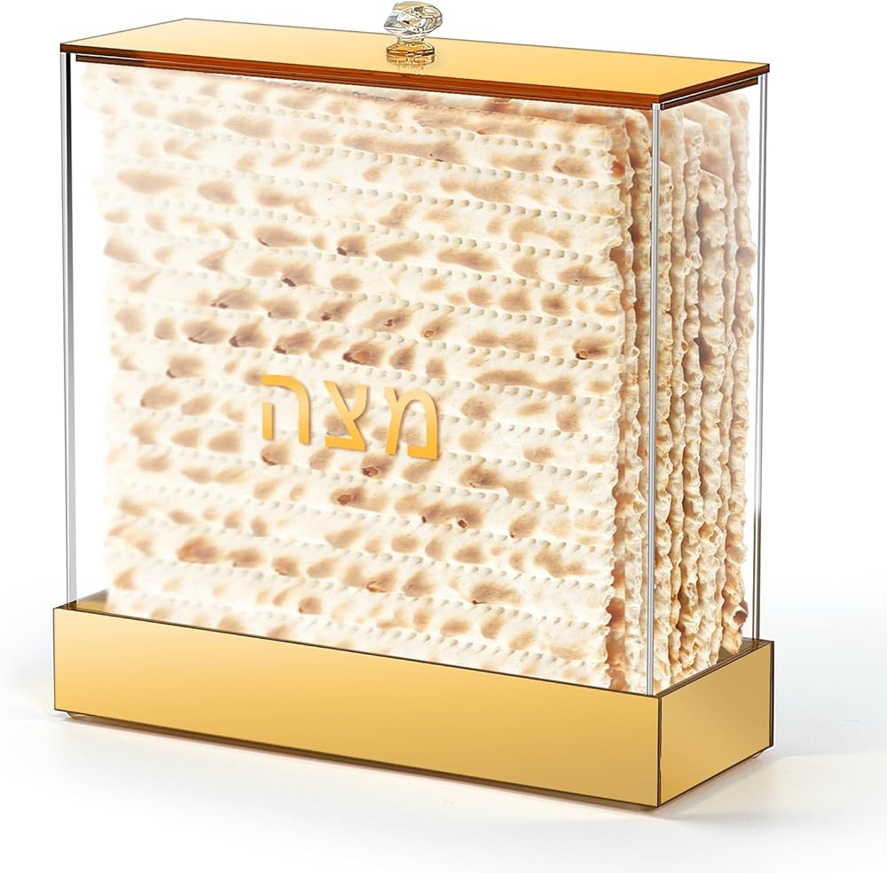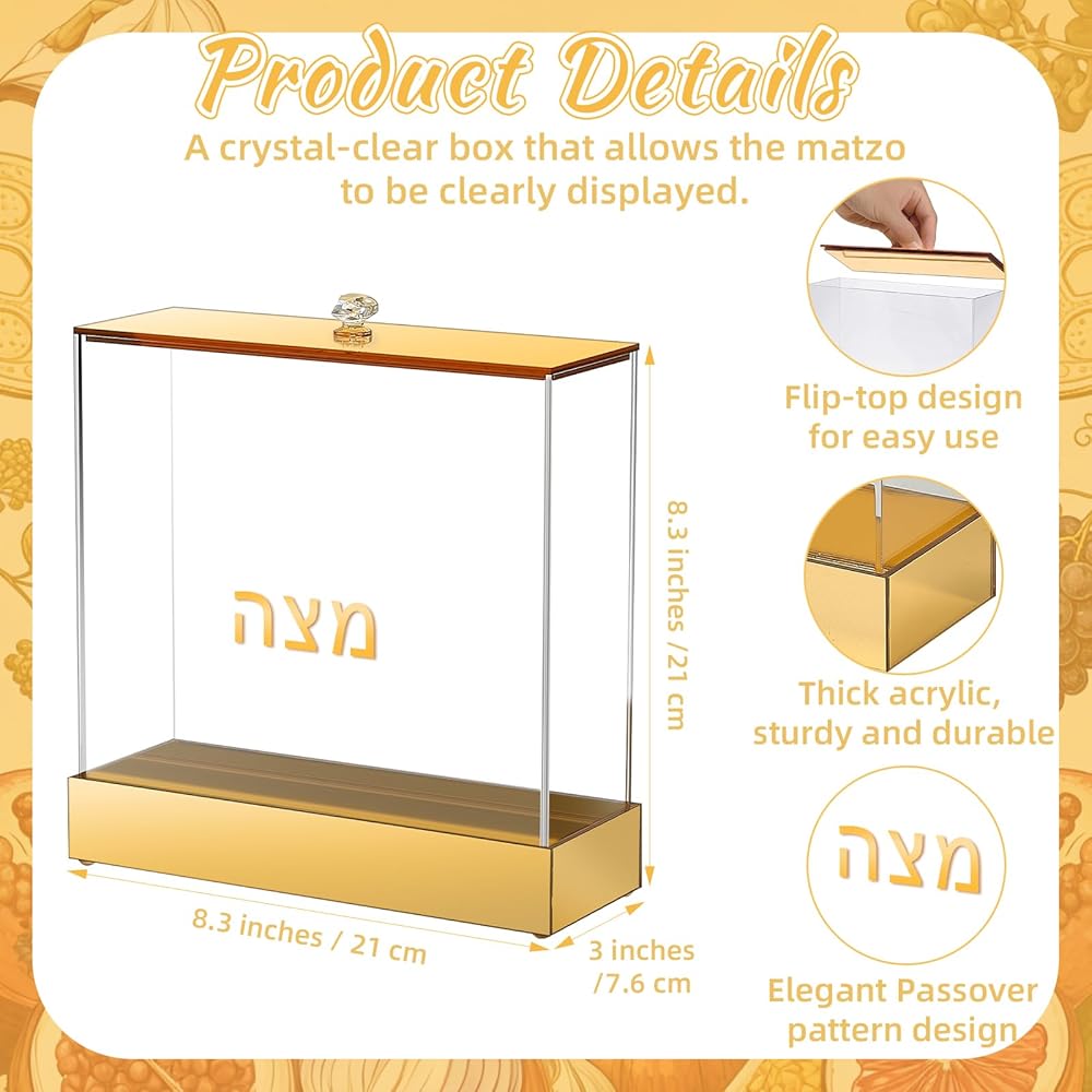 • Exquisite Design: Featuring a transparent design, our Passover Seder matzah holder allows you to clearly see the matzo inside, creating a warm display effect. Adorned with a gold lid and base, and the Hebrew word “פֶּסַח”, it seamlessly blends traditional and modern aesthetics, creating a sacred and dignified festive atmosphere for your Passover gathering