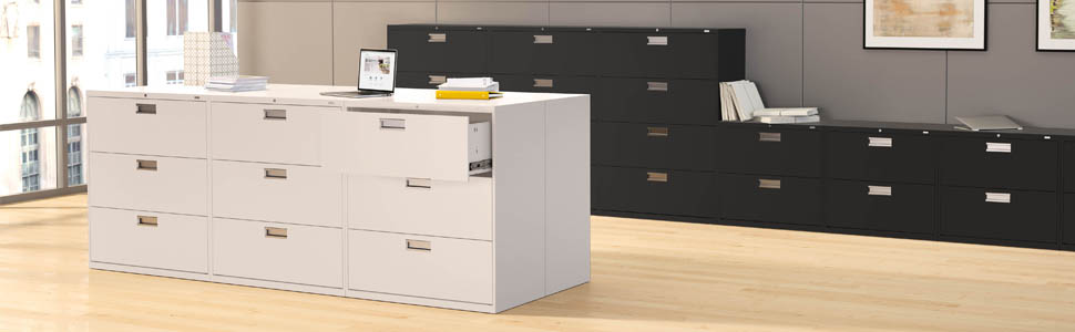 Well-engineered and incredibly strong, Brigade 600 Series laterals from HON are built for the demands of high-activity filing. This five-drawer, 42"W model features a sturdy double-walled base to resist tampering and strengthen the case. It accepts letter or legal hanging file folders. Bright Aluminum handle coordinates with Brigade pedestals. Finish color is Black.