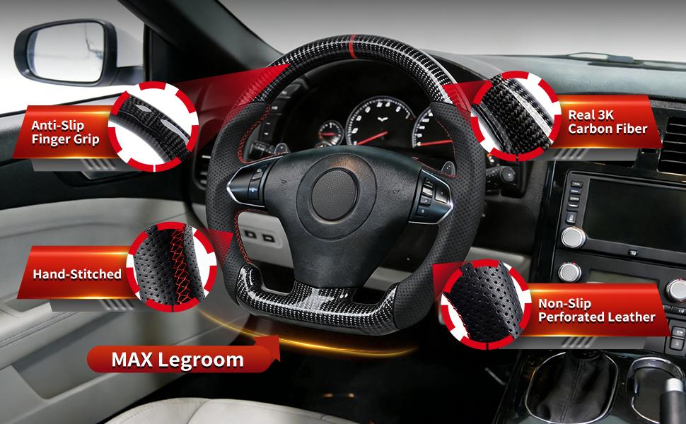 [Race-Ready Flat Bottom Design] Upgrades the stock round wheel to an aggressive D-Shape Flat Bottom. This design increases legroom for easier entry and exit—crucial for the low-slung Corvette cockpit. The ergonomic contours at 3 and 9 o'clock are sculpted to fit your hands naturally, reducing fatigue during spirited driving.