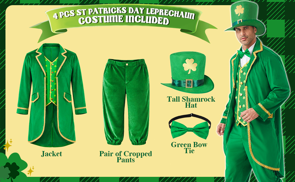 Complete 4-Piece Leprechaun Outfit: This men's St. Patrick's Day costume includes 1 jacket, 1 pair of cropped pants, 1 green bow tie, and 1 tall shamrock hat—everything you need to instantly transform into a classic Irish leprechaun. Perfect for parades, bar crawls, holiday parties, school events, and themed celebrations