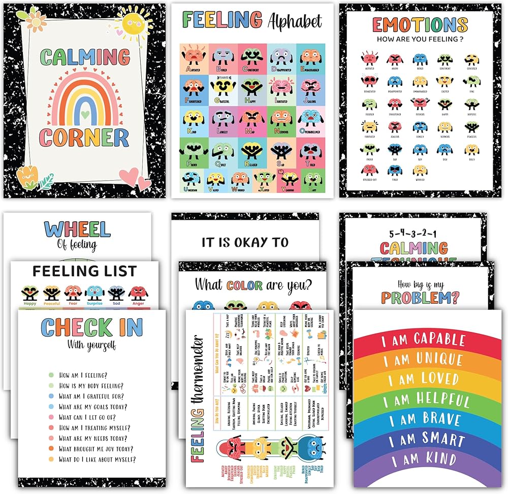 Set 12 Calming Corner Posters for Classroom Must Haves For Teachers, Composition Notebook Classroom Decor, 10x12 Calm Down Corner Supplies, Feelings Chart For Kids Ages 4-8, Feelings Wheel Poster