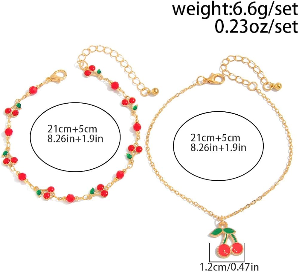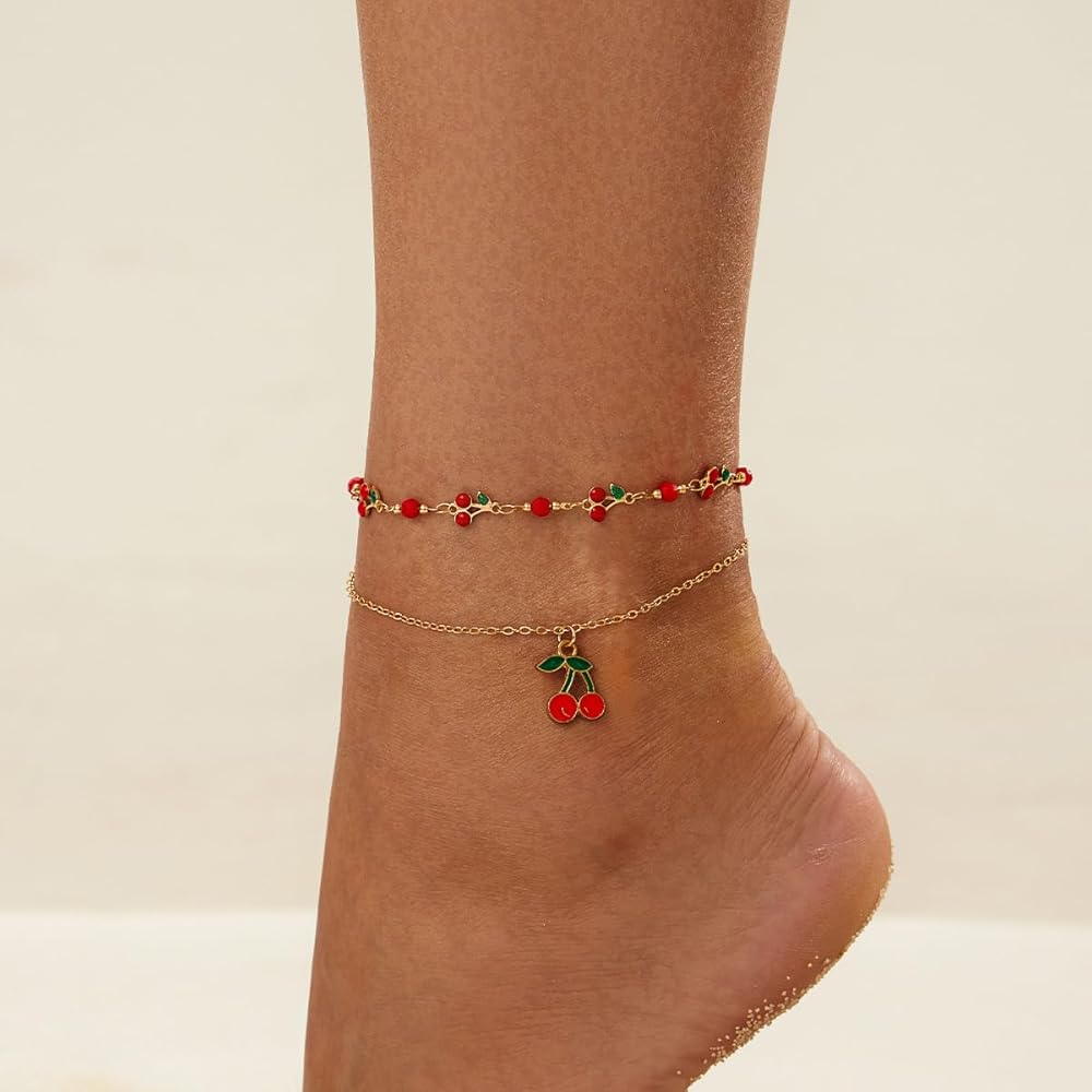 5-Piece Anklet Chain Set for Women - Bohemian Beach Crystal Chain & Cherry Drip Oil Anklets, Minimalist Metal Wheat Braid Foot Jewelry for Summer Vacation Festival