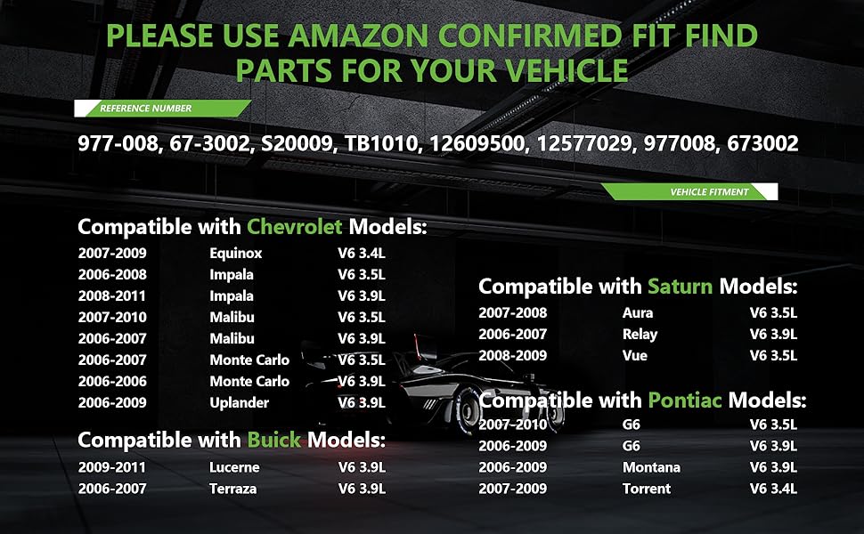 [Vehicle Fitment-1]: Compatible with Buick Lucerne 2009-2011 V6 3.9L, Terraza 2006 V6 3.9L FWD, Terraza 2007 V6 3.9L; Compatible with Chevrolet Equinox 2007-2009 V6 3.4L, Impala 2006-2008 V6 3.5L, Impala 2009-2011 V6 3.9L, Malibu 2007-2010 V6 3.5L, Malibu 2006-2007 V6 3.9L, Monte Carlo 2006-2007 V6 3.5L, Monte Carlo 2006 V6 3.9L, Uplander 2006 V6 3.9L FWD, Uplander 2007-2009 V6 3.9L