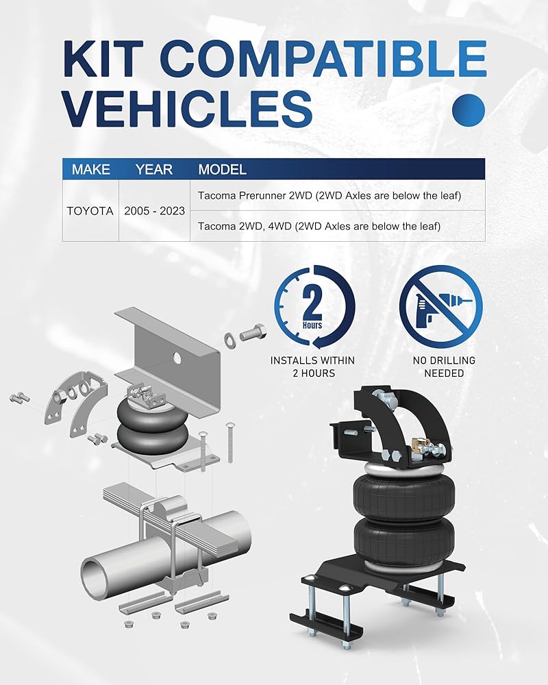 Vehicle Compatibility - This air suspension kit is compatible with the following vehicles: TOYOTA Tacoma Prerunner 2WD 2005-2023, Tacoma 2WD/4WD 2005-2023 (2WD Axles are below the leaf)