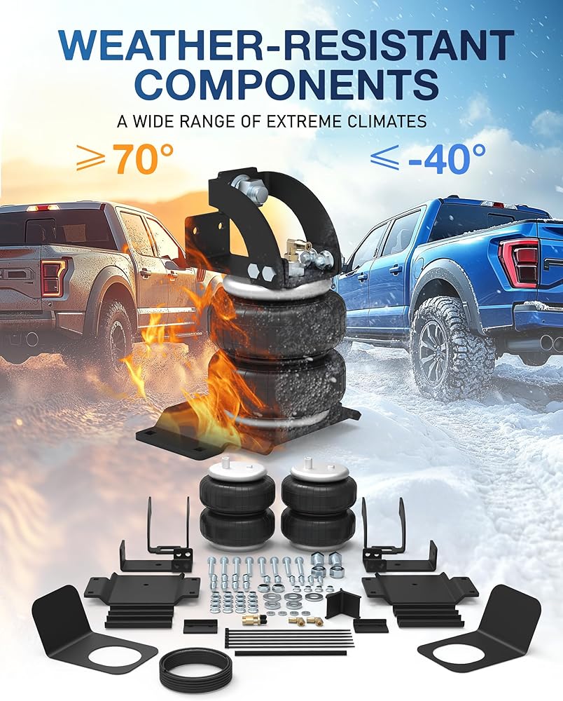 Effortless Installation - Designed for user-friendliness, our kit eliminates the need for drilling. All necessary holes are pre-drilled, making installation on your truck models seamless. The set includes two air bags, brackets, bolts, and nuts for straightforward installation. To further simplify the process, inflation valves, air fittings, tubing, and a comprehensive owner's manual are included