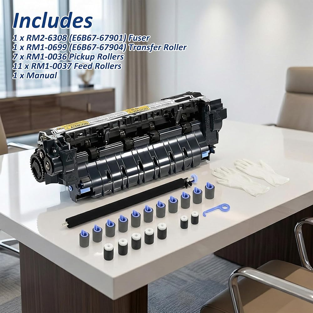 This complete replacement kit includes all essential components for a full printer refresh: 1 x RM2-6308 (E6B67-67901) Fuser, 1 x RM1-0699 (E6B67-67904) Transfer Roller, 5 x RM1-0036 Pickup Rollers, 10 x RM1-0037 Feed Rollers, and a manual