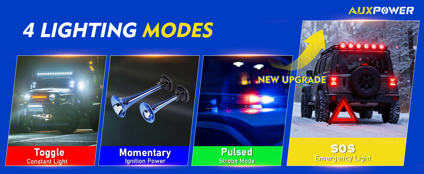 4 Lighting Modes: The switch panel offers four lighting modes: TOGGLE (device always on), MOMENTARY (press and hold to activate), PULSED (strobe), and SOS (emergency light). You can select the mode that suits your needs for easy control of multiple devices.